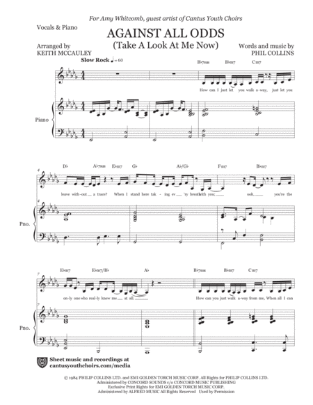 Description: From the Cantus Youth Choirs Pop Series, comes an arrangement of Phil Collins’ Against All Odds (Take a Look At Me Now) as performed by Mariah Carey. This arrangement is for low female solo and the download comes with vocals and piano, violin 1 and 2, viola, cello, double bass, piano, electric guitar, drum set, and full director’s score.