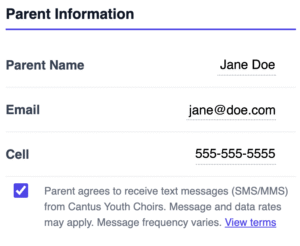 Cantus Youth Choirs manages singer contact information under the umbrella of parent/guardian contact information. When a family joins Cantus and registers singer(s) for our program, we collect cell phone, email, SMS/MMS (texting) consent from singers AND parents. All of this is saved under a parent email address.